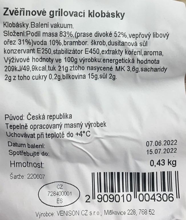Zvěřinové grilovací klobásky